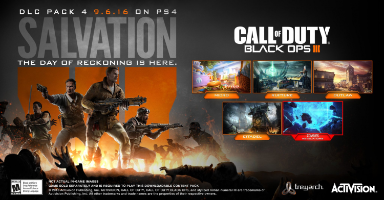 Activision сообщила о охватываемом последнего добавления Salvation к Call of Duty: White Ops 3. Оно содержит 4 мультиплеерные карты и свежую цель Revelations для режима Zombies.
